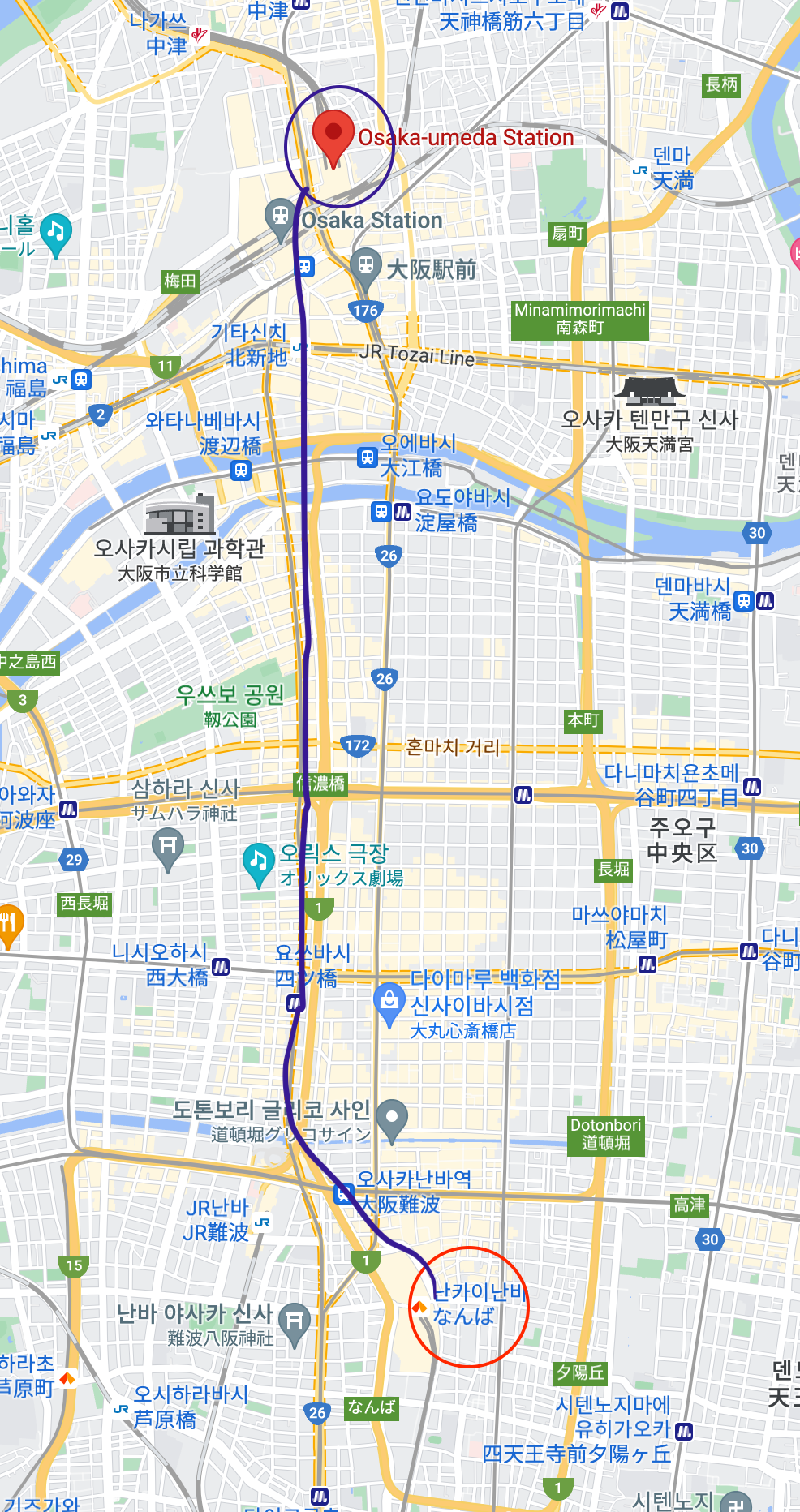 그 바로 밑에 제가 내렸던 "미도스지선 니시우메다" 역에서 걸어서 15분 정도면 바로 이동할 수 있습니다.
