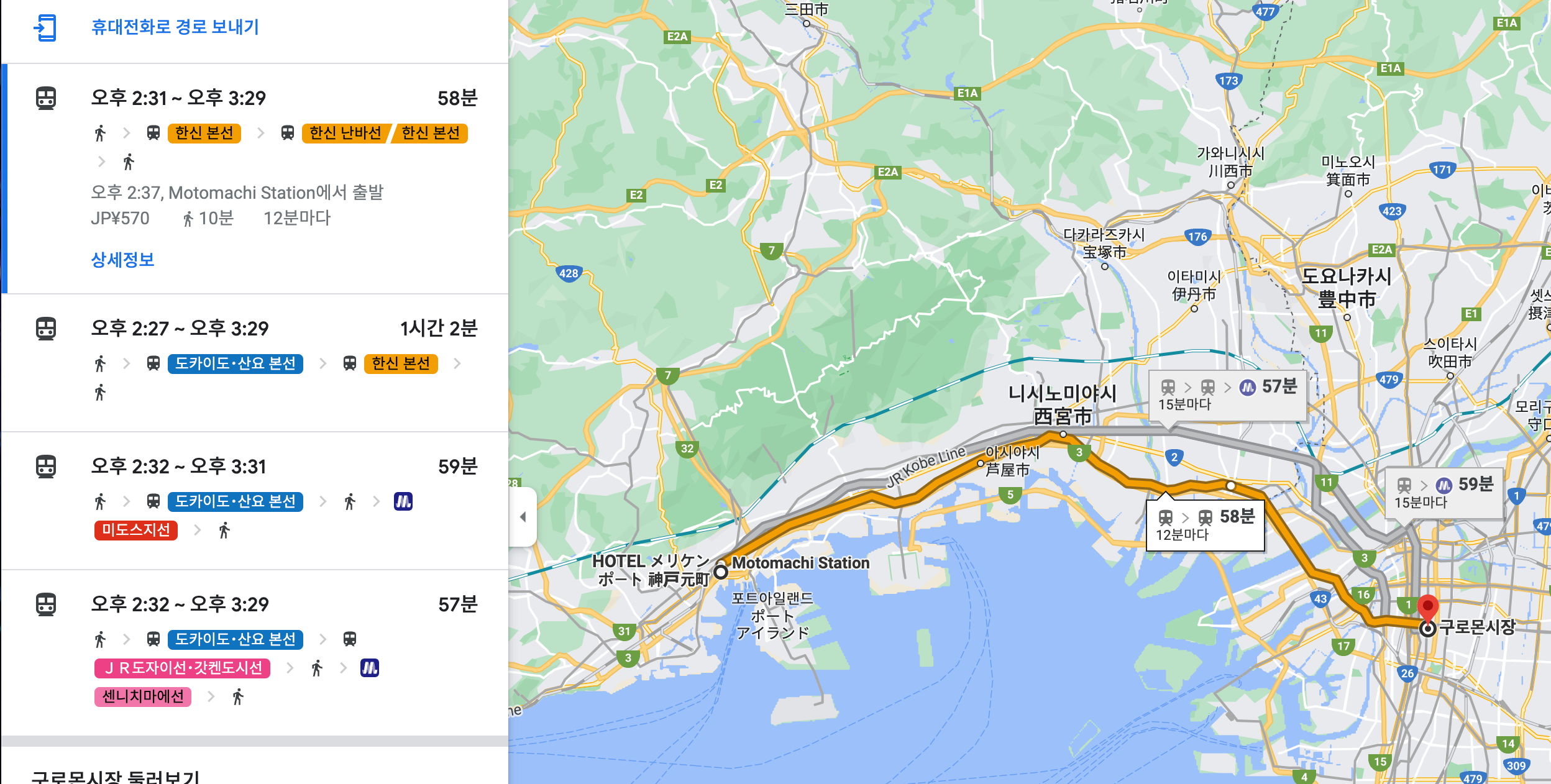 한신 선을 타고 구로몬시장 까지 한시간 조금 넘게 걸리는 거리입니다.