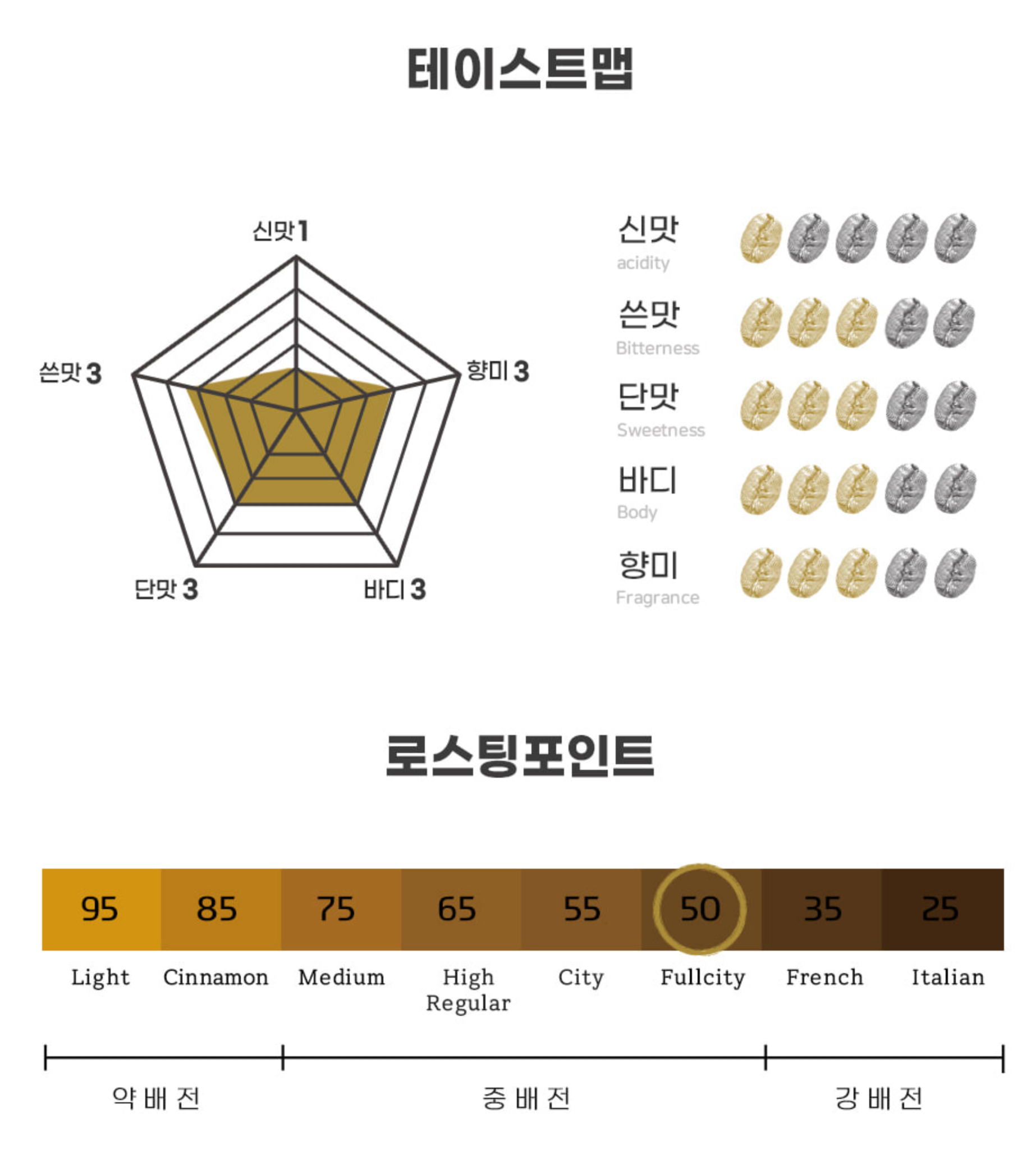 산미를 제외하고는 밸런스가 적당히 잡혀있는 것을 확인 할 수 있습니다.