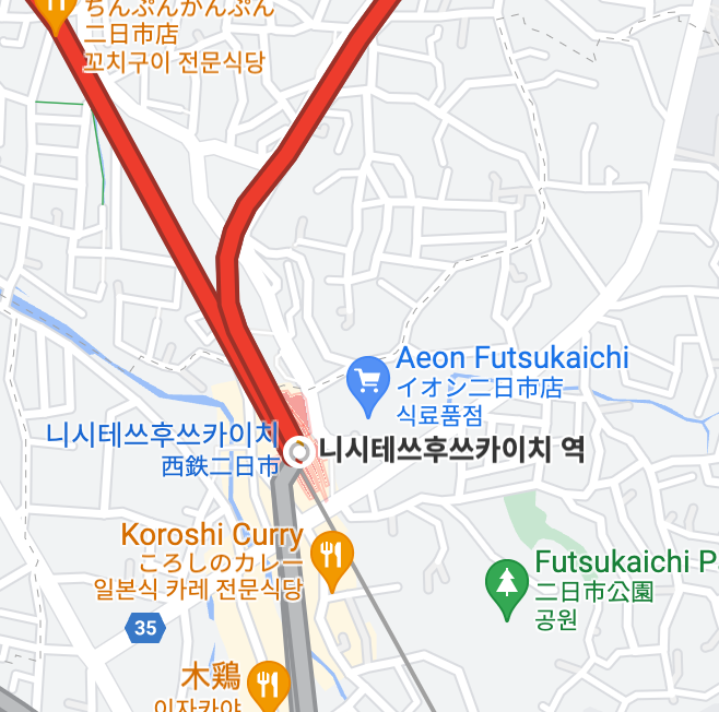 니시테쓰후쓰카이치 (발음 너무힘드네) 역에서 한번 환승을 하고 가셔야 합니다.