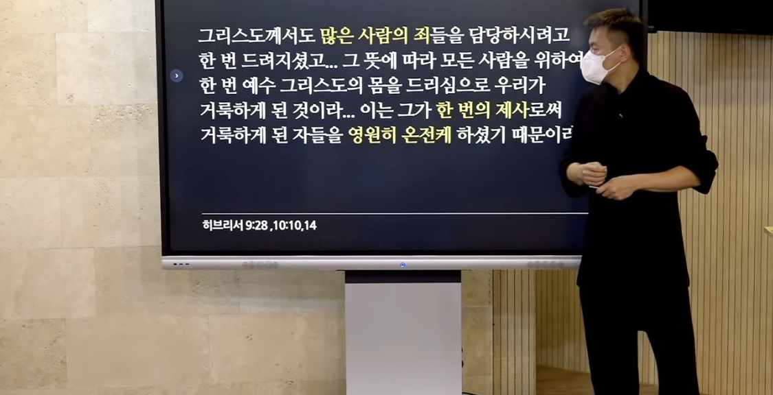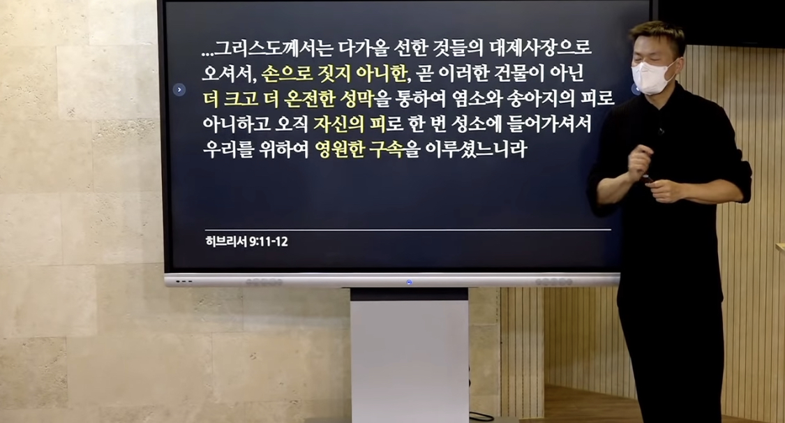 한번 예수님께서 몸을 버리시는 한번의 희생으로서 우리모두가 예배를 드릴 수 있는 존재가 되어 지성소라는 공간이 필요가 없어진 것이라고 이야기합니다.