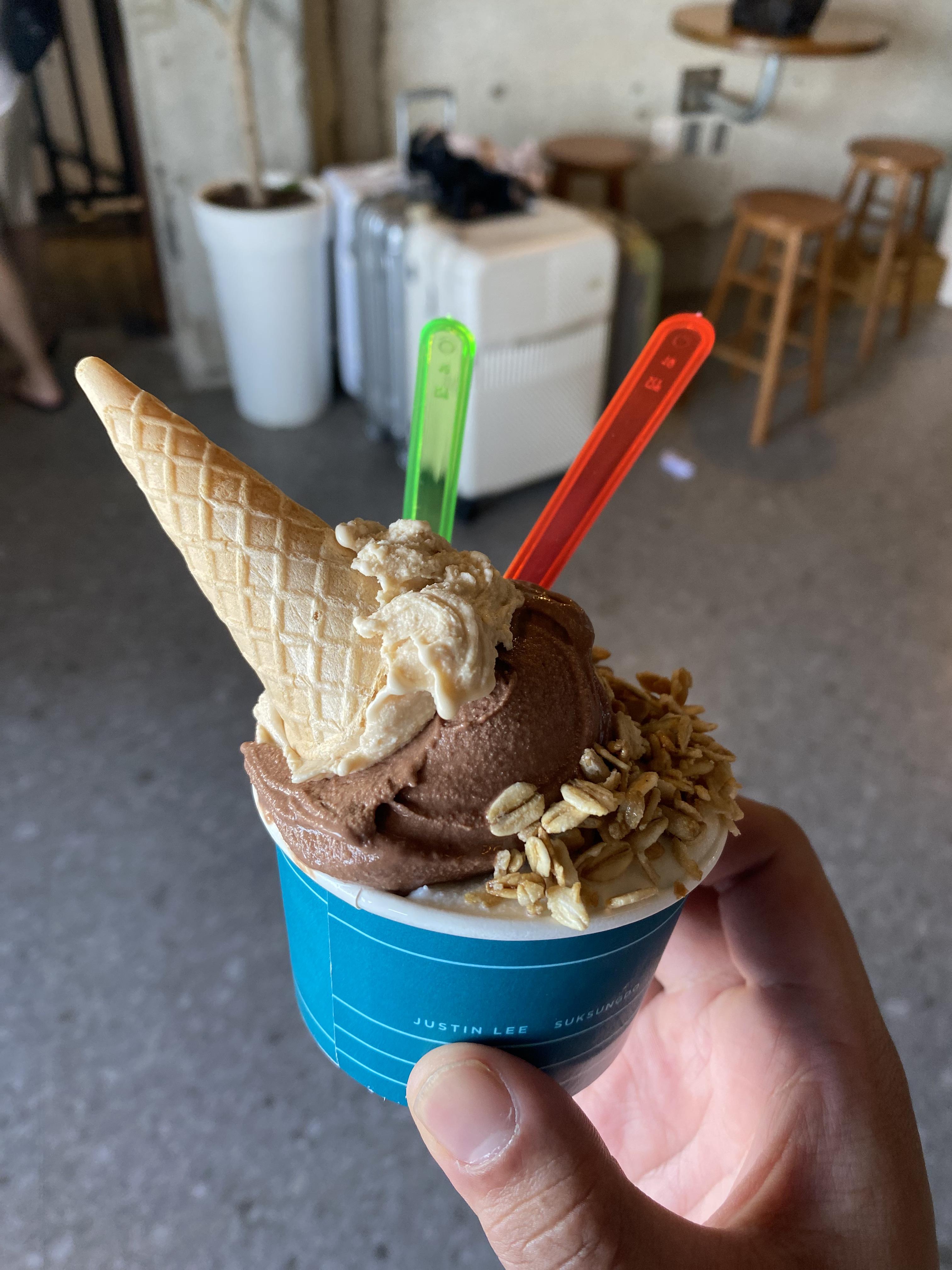 맛 두가지와 함께 토핑을 선택 할 수 있습니다.