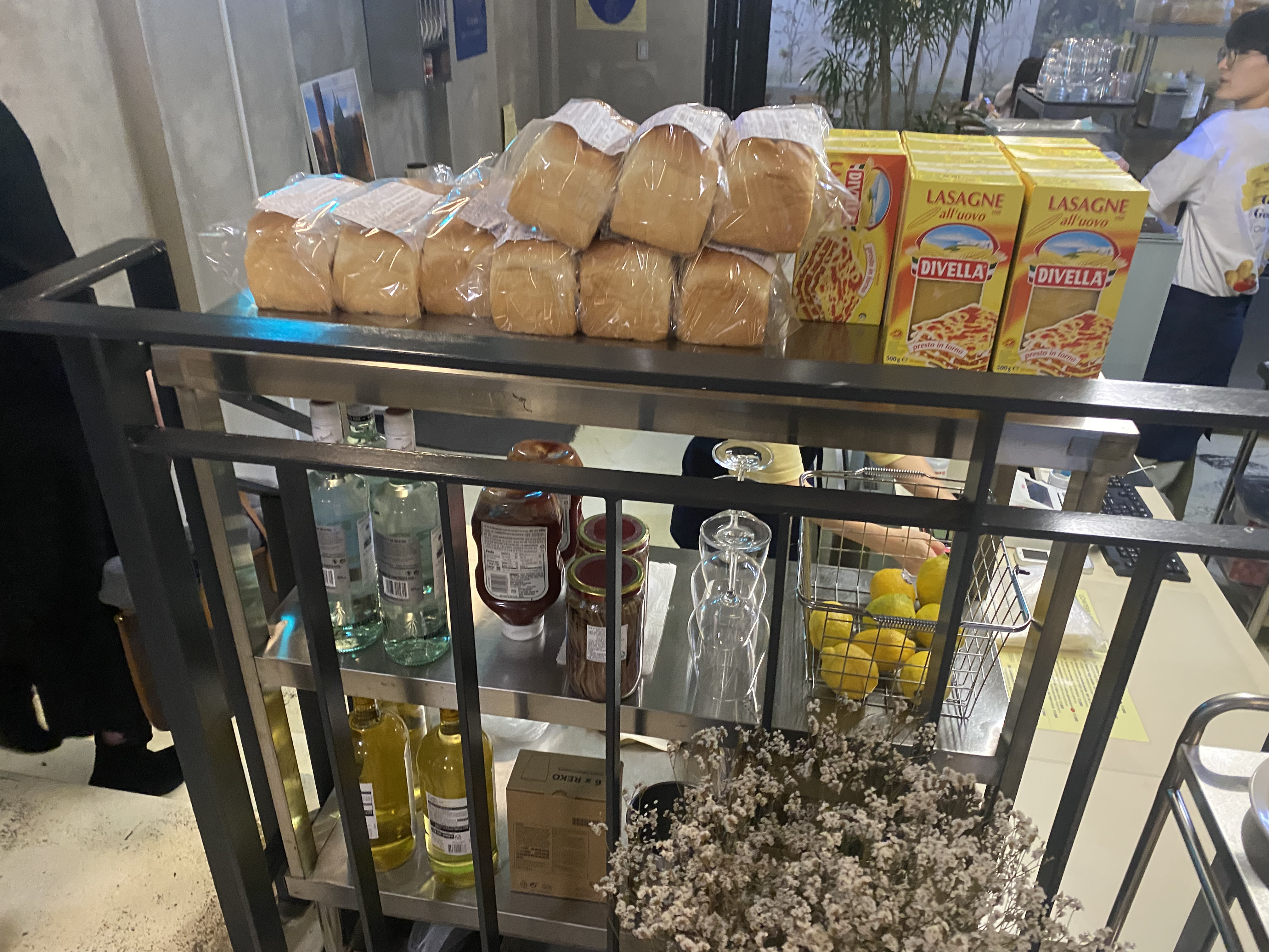 진열되어있는 빵, 토마토소스, 파스타류.
