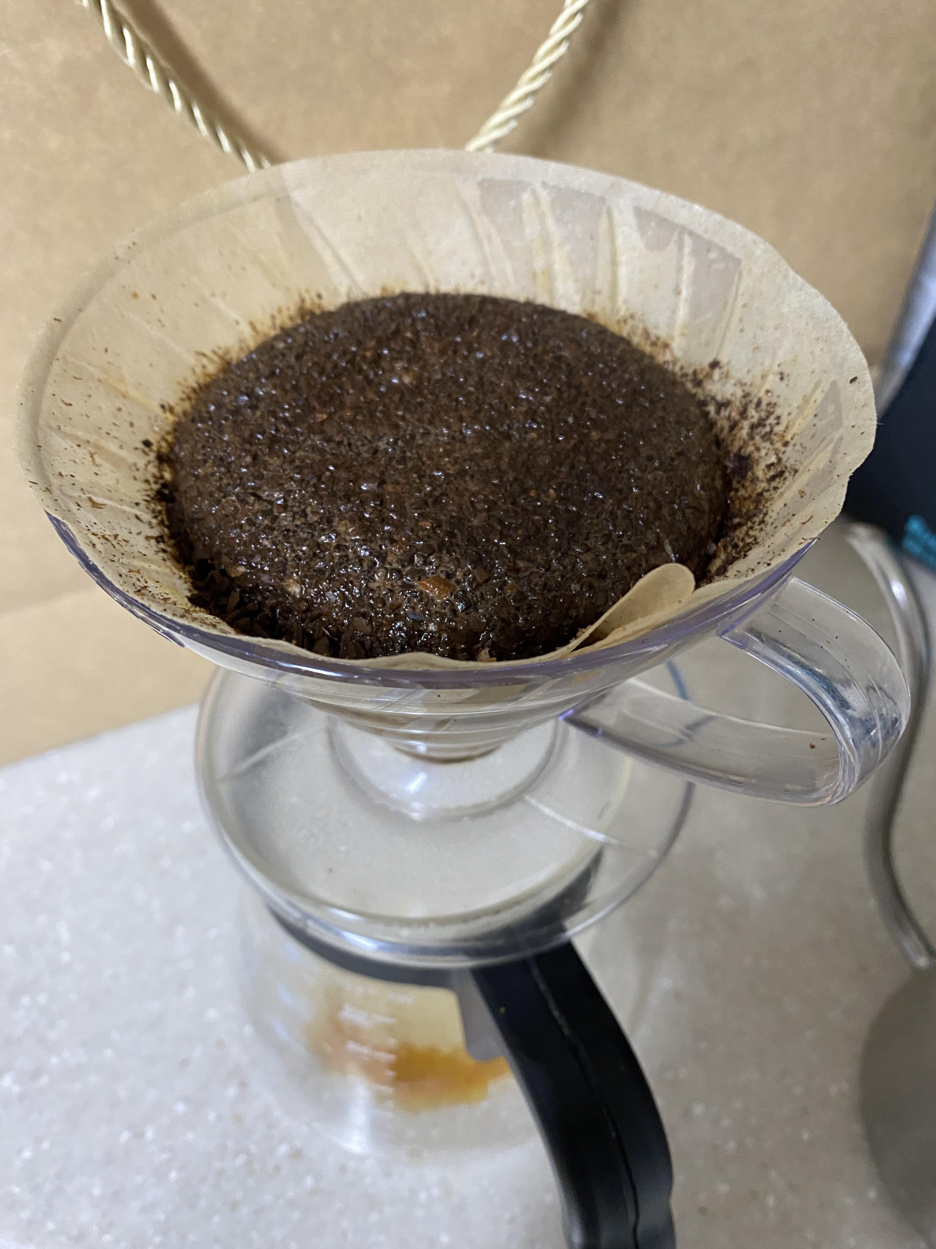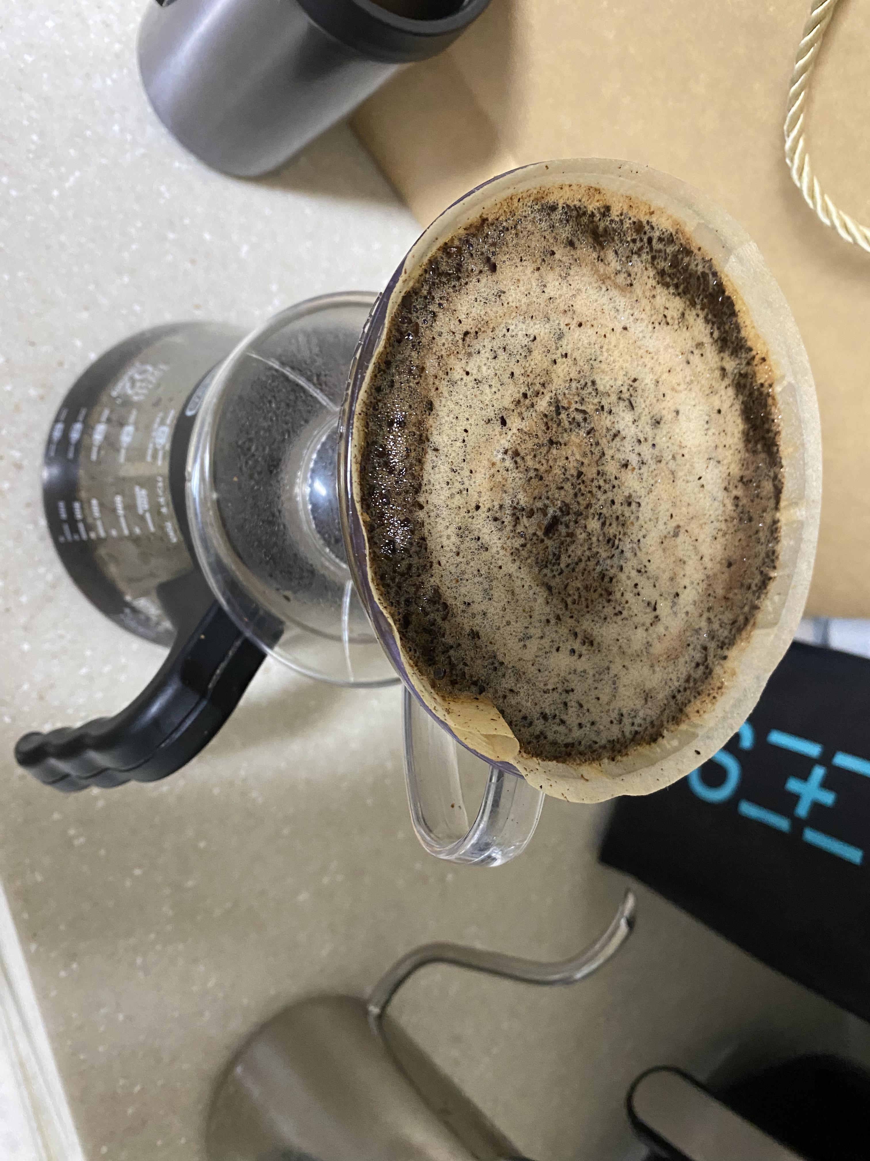 원두가 부풀어 오르면서 밑으로 가라앉고, 가벼운 원두는 위로 올라오고, 아직 추출되지 못한 무거운 원두는 밑으로 내려가는