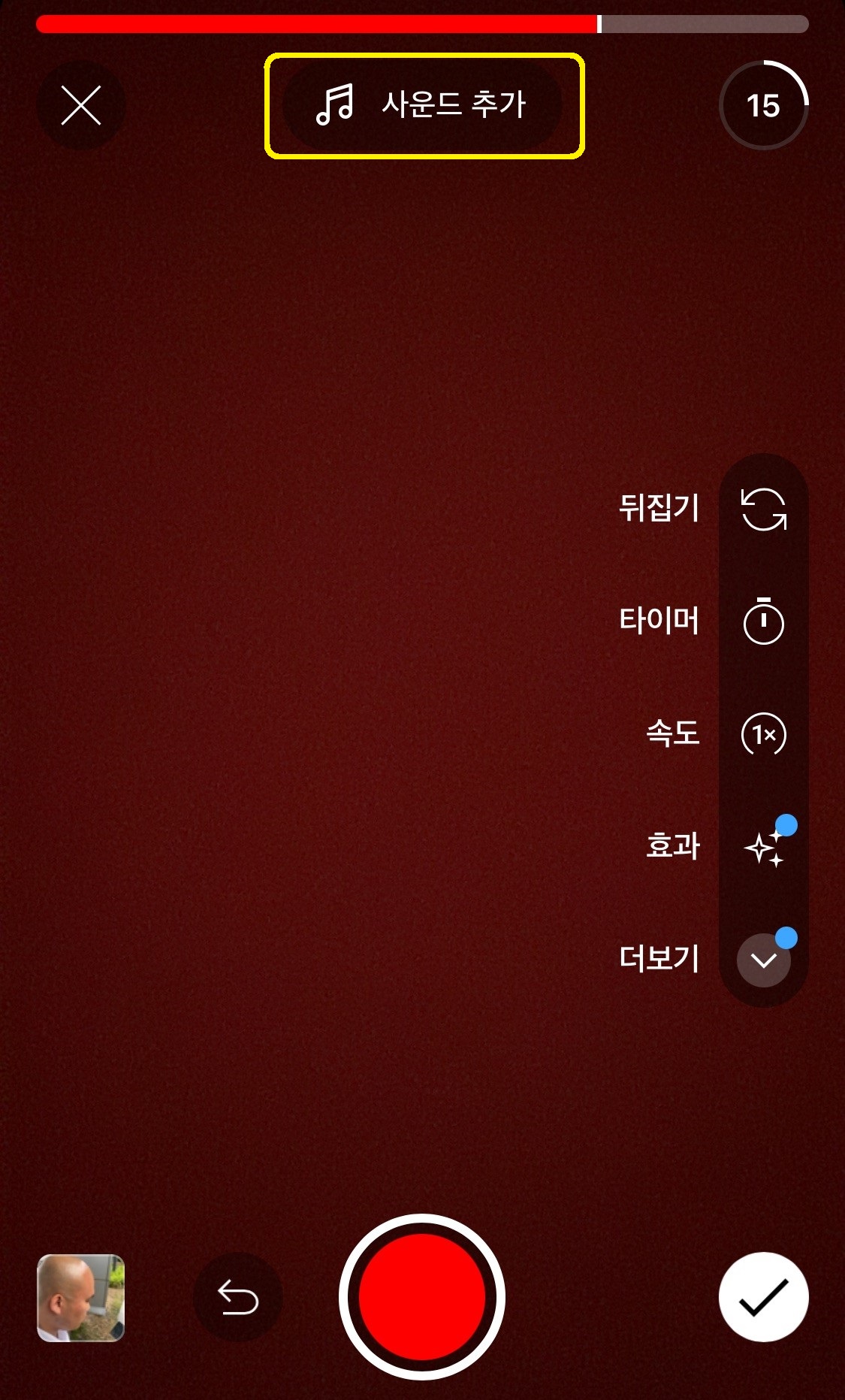 하나. 업로드 하실 영상을 선택하신 후, 상단의“사운드 추가” 를 클릭해 주세요!