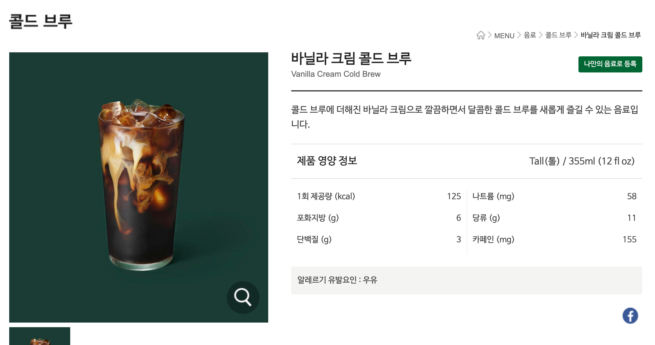 제가 즐겨 마시는 스타벅스의 바닐라크림 콜드브루의 가장 작은 사이즈인 Tall 사이즈에 들어가는 설탕량이 더 많은 것을 확인 할 수 있었습니다..