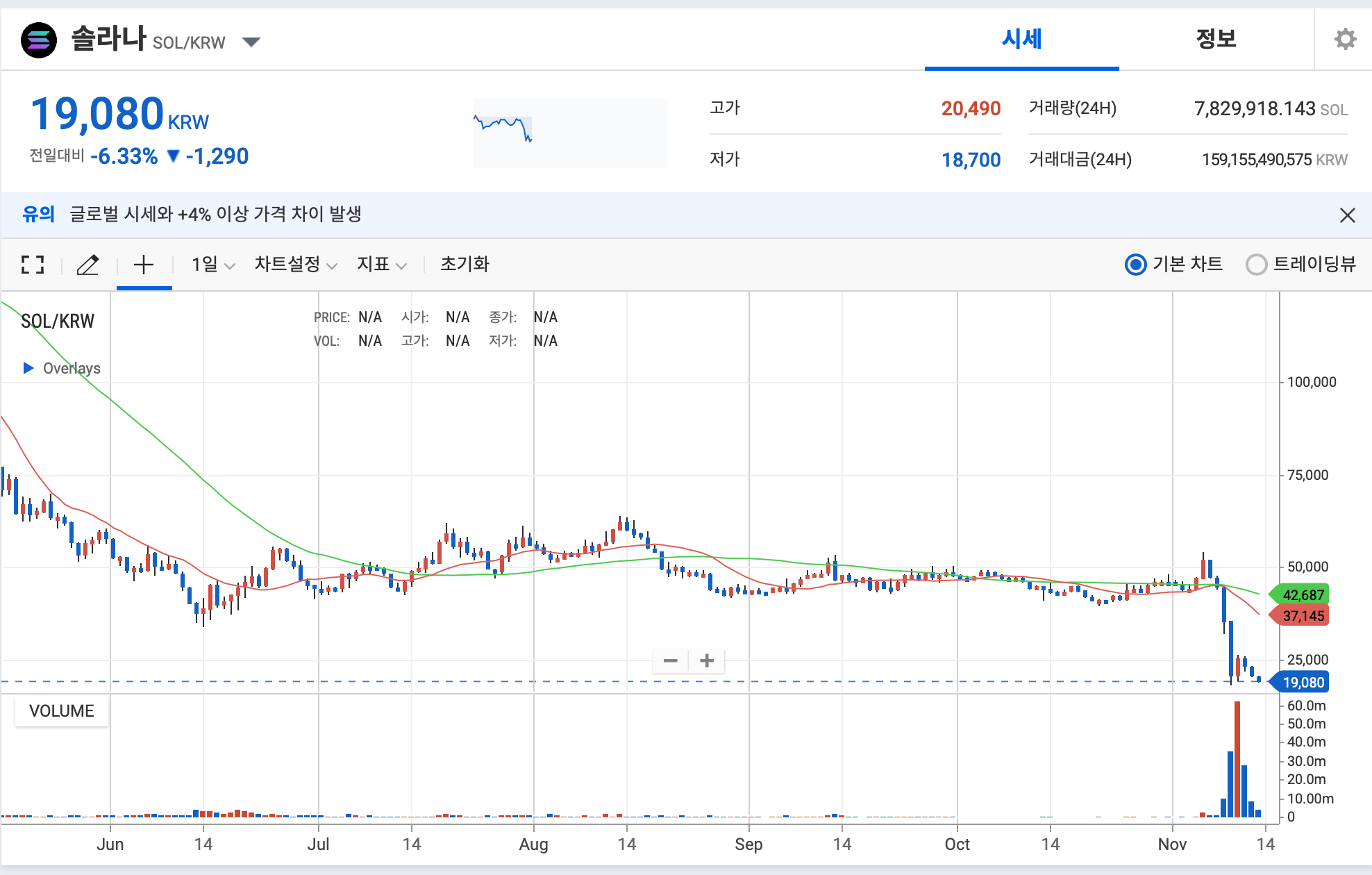 밑 사진은 글을 작성중인 2022년 11월 13일 기준의 비트코인과 우량주급 가상화폐 솔라나의 차트입니다