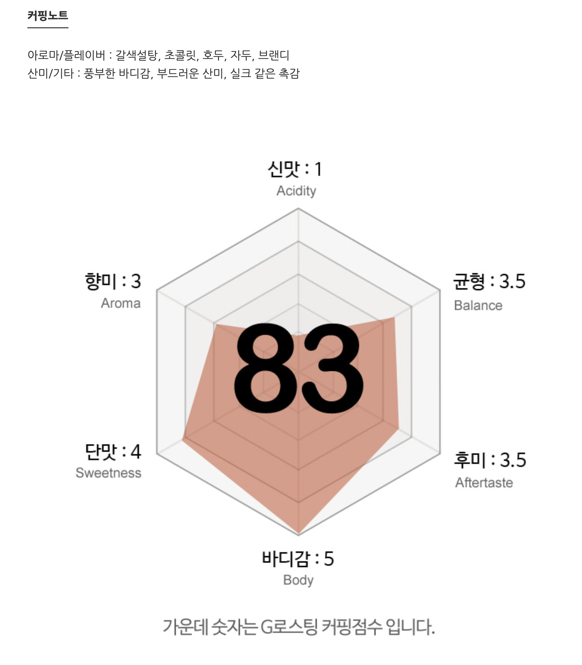 매우 풍부한 바디감과 짙은 흙내음. 견과류의 고소함과 흑설탕의 단맛 산미 1.5│바디감 5│단맛 3.5│아로마 3