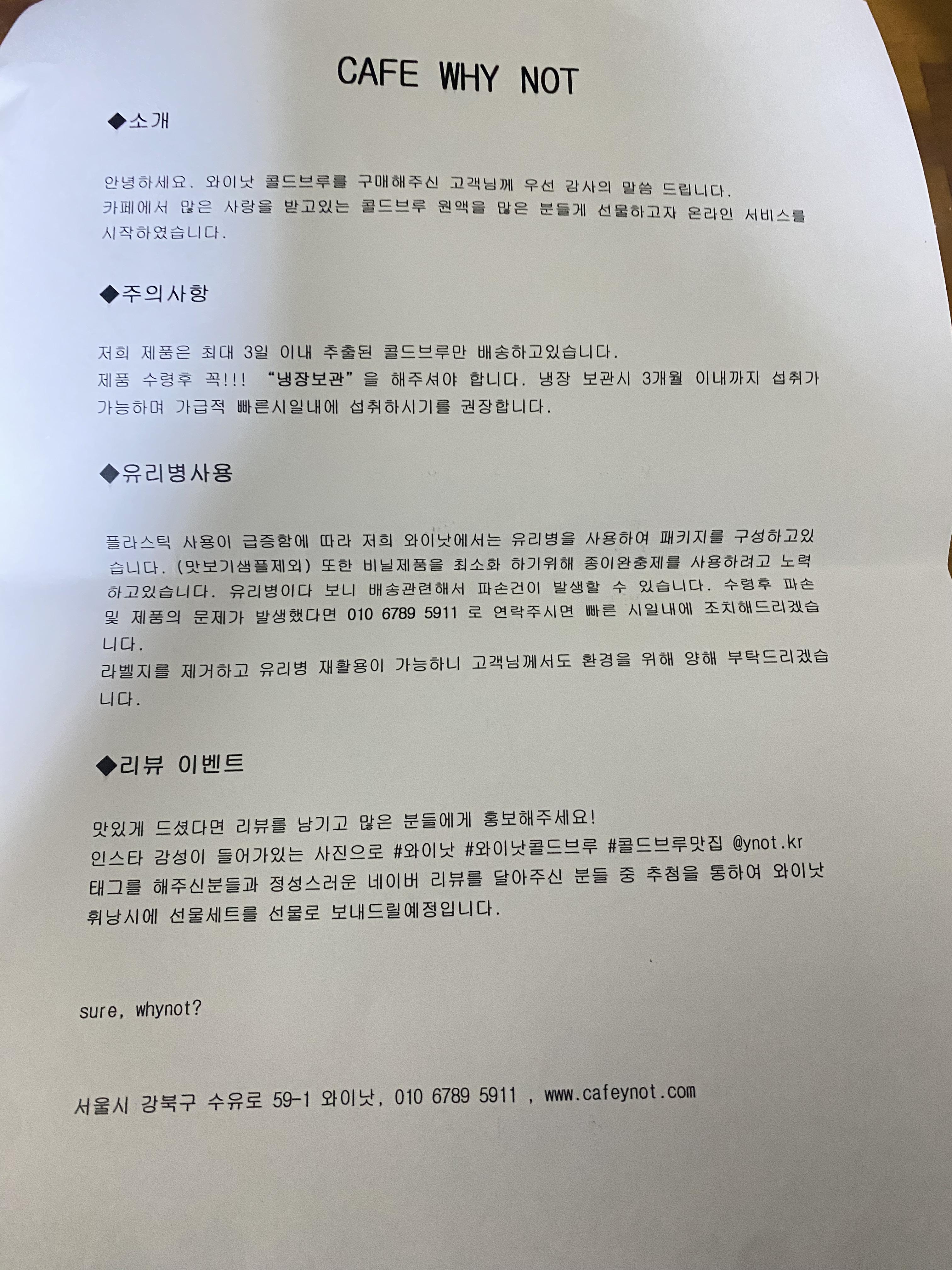 수유 와이낫 카페에서 제품을 만들어 판매하고 있는 콜드브루 입니다.